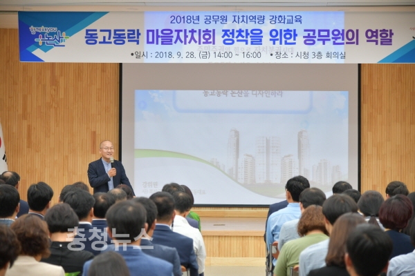 논산시(시장 황명선)는 28일 회의실에서 직원 200여명을 대상으로 ‘동고동락 마을자치회의 성공적인 정착을 위한 공직자의 역할’을 주제로 2018 공무원 자치역량강화교육을 실시했다.