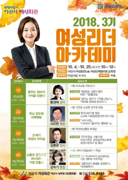 한편, 지난 제1기 여성리더 아카데미는 지난 6월과 7월“행복한 부모가 행복한 인재를 만든다”, “얼굴의 비밀과 처세의 기술”,“쉽고 재미있는 재테크” 등 건강과 교육, 경제분야를 주제로 총 5회 진행해 시민들의 큰 호응으로 성황리에 마무리됐다.