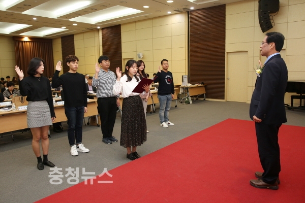 2일 한남대 ‘체인지메이커 발대식’에서 사회적경제 창업동아리 학생들이 이덕훈 총장에게 선서를 하고 있다.