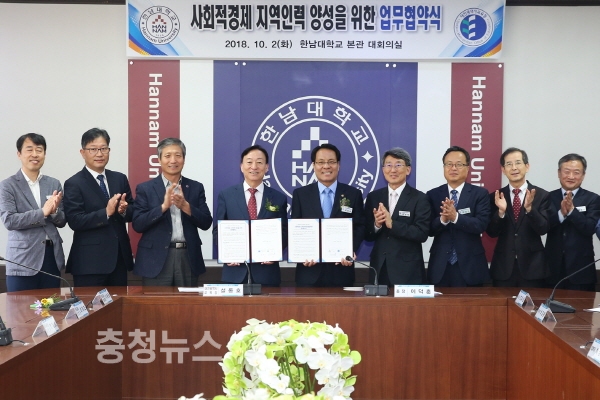 2일 이덕훈 한남대 총장(우측 다섯 번째)과 설동호 대전시교육감(왼쪽 네 번째)이 ‘사회적경제 지역인력 양성을 위한 업무협약’을 체결하고 있다.