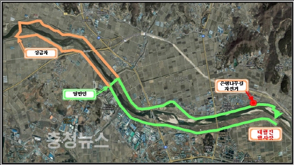 아산지구 곡교천 생태하천조성사업 구간에 조성된 자전거전용도로를 따라 원점 회귀할 수 있는 구간으로 초보자도 부담 없이 가을을 즐길 수 있도록 일반인은 8km, 동호회 14.3km 구간으로 라이딩 코스 선정을 했다.