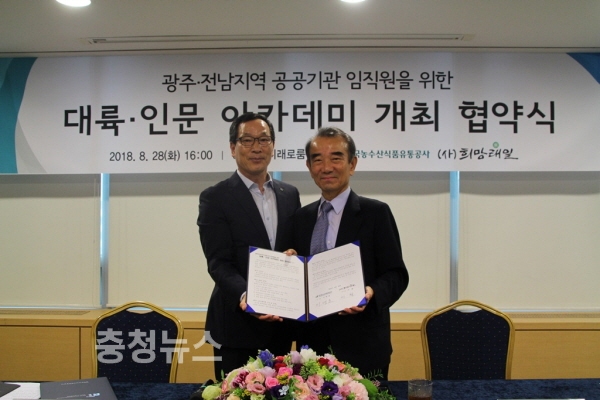 한국농수산식품유통공사(aT, 사장 이병호)와 (사)희망래일(이사장 이철)은 지난 8월 28일 aT센터에서 빛가람혁신도시 공공기관 임직원들을 대상으로 '대륙·인문 아카데미' 강좌 개설을 위한 협약을 체결했다.