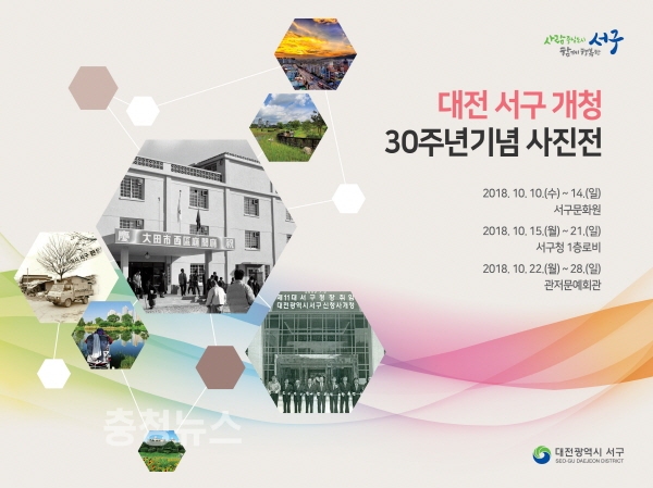 대전 서구(구청장 장종태)는 10일부터 28일까지 서구문화원 등 3곳에서 ‘서구의 어제와 오늘’을 주제로 한 ‘대전 서구 개청 30주년 기념 사진전’을 개최한다.