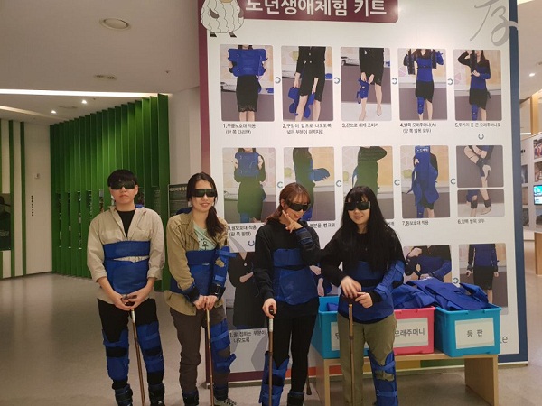 이번 방문은 노인기 신체 변화를 직접 느끼고 체험함으로써 향후 노인을 위한 영양관리자로서 노인을 제대로 이해하기 위한 목적으로 진행됐다. 학생들은 척추와 관절의 변화를 느낄 수 있는 노인 생애 체험 키트를 비롯해 모래주머니, 녹내장과 백내장 체험을 위한 고글 등을 착용하고 노인들의 불편함을 직접 체험해 보는 시간을 가졌다.