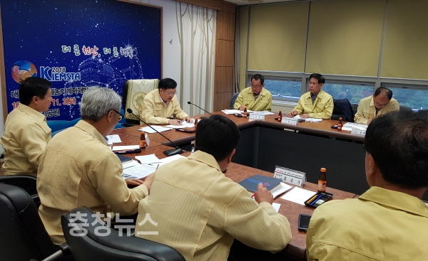 충남 천안시가 한반도를 향해 북상 중인 제25호 태풍 ‘콩레이’에 대비해 시청 영상회의실에서 부시장 주재로 상황판단회의를 실시하고 대처계획을 점검했다.