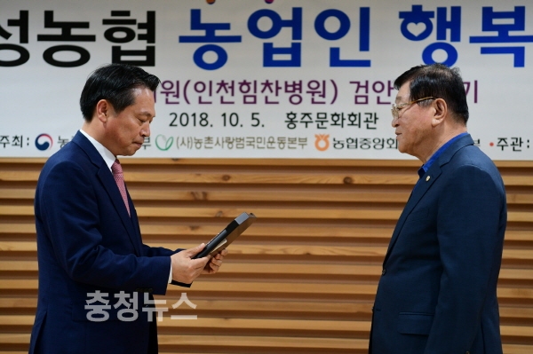 김석환 홍성군수가 5일 농업·농촌 발전에 기여한 공로를 인정받아 김병원 농협중앙회장으로부터 감사패를 받았다.