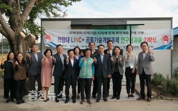 건양대와 (주)레오플은 이러한 연구성과물을 활용하는 방안으로 지역사회 기부를 결정했고, 논산시 주민생활지원과 희망복지지원팀의 협조로 15개 읍면동의 수요를 조사했다. 복지사각지대 발굴을 통해 주거환경 및 거동이 불편한 은진면 와야리의 독거노인 김영술 가구를 선정하여 ‘스마트 모듈러 주택’을 설치하고 지난 4일 오후 기탁식을 진행했다.