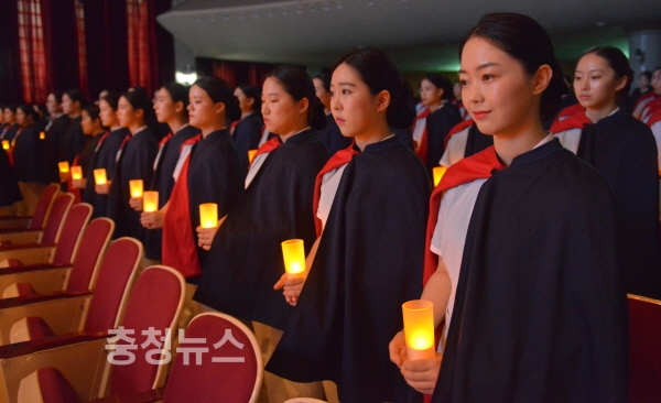 “나는 일생을 의롭게 살며 전문 간호직에 최선을 다할 것을 하나님과 여러분 앞에 선서합니다”로 시작되는 나이팅게일 선언문 낭독을 시작으로 선서생들과 교수진은 나이팅게일의 간호정신, 주변을 비추는 봉사와 희생정신을 상징하는 촛불을 밝혔다.