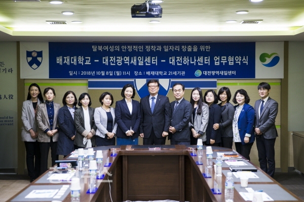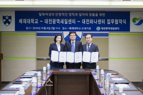 배재대와 대전하나센터(센터장 배영길), 대전광역새일센터(센터장 김정현 교수)는 8일 배재21세기관에서 ‘탈북여성의 안정적인 정착과 일자리 창출을 위한 업무협약식’을 가졌다.
