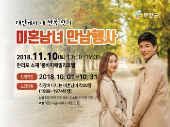 군은 다음달 10일 만리포 롱비치패밀리호텔에서 ‘2018 태안군 미혼남녀 만남행사’를 개최한다고 8일 밝혔다.