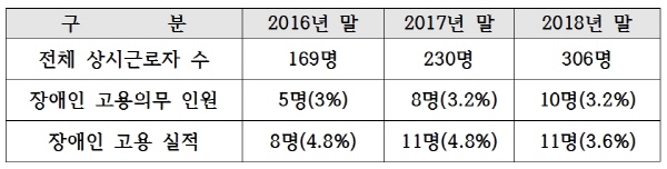 그러면서 "올해까지 고용하고 있는 장애인은 2016년 8명(169명의 4.8%), 2017년 11명(230명의 4.8%), 2018년 11명(306명의 3.6%)"이라고 설명했다.