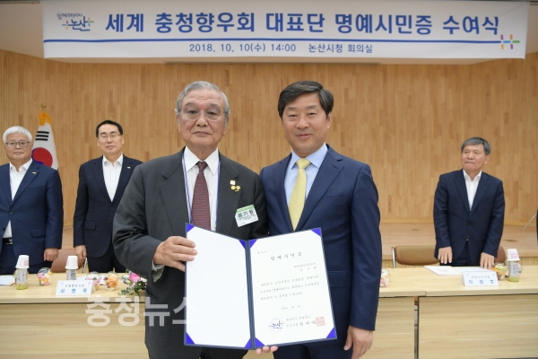 논산시(시장 황명선)는 지난 10일 시청 회의실에서 미국, 호주, 독일 등 14개국에서 활동하고 있는 세계 충청향우회 대표단 31명에게 논산시 명예시민증을 수여했다.