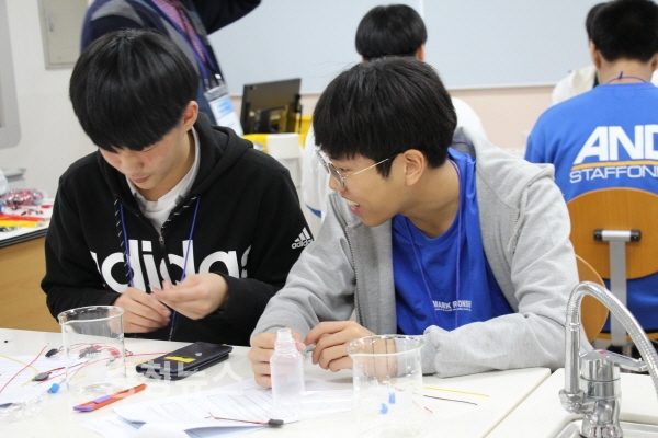 양지고 학생들이 과학캠프 프로그램에 참여하여 집중하고 있다.