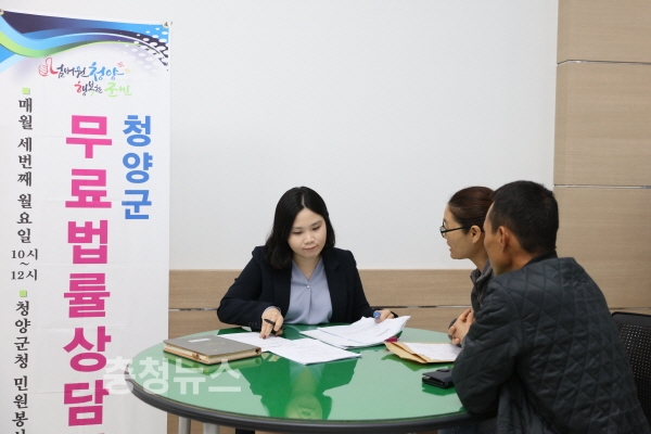 충남 청양군이 각종 법률문제로 어려움을 겪는 주민들을 위해 운영하는 ‘무료 법률상담서비스’가 군민들로부터 꾸준한 호응을 얻고 있다.