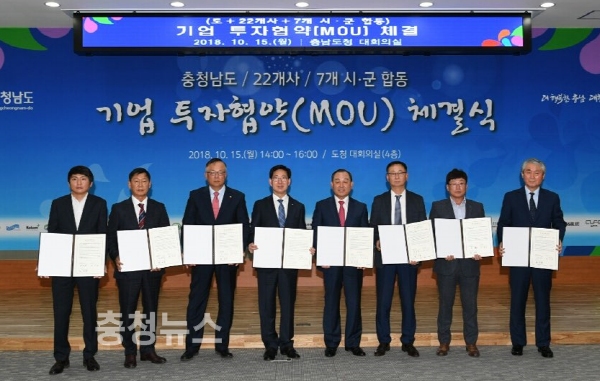 이번 협약식에는 양승조 도지사와 황선봉 예산군수를 비롯한 6개 시군과 22개 기업 관계자들이 참여해 합동 투자협약(MOU)을 체결했다. 이번에 예산군에 투자하기로 협약을 맺은 기업체는 ㈜네오오토 등 7개 기업으로 예산군내 산업단지 2만여 평 부지에 746억 원 규모의 신설투자를 약속했다.