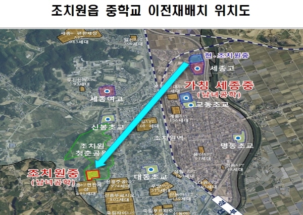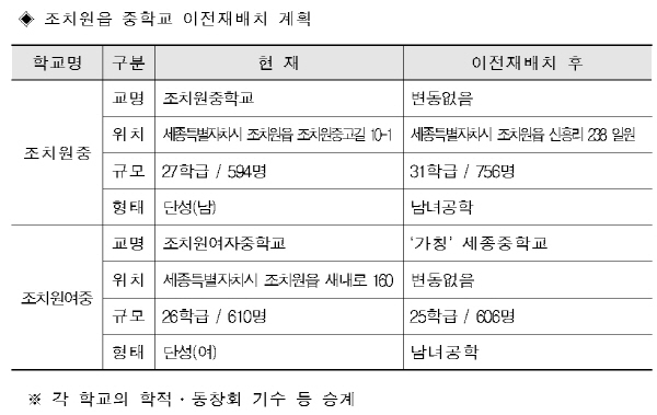 규모는 조치원중 31학급 756명, ‘가칭’ 세종중 25학급 606명이며, 조치원중 이전에 소요되는 총사업비는 약 248억원으로 조치원 청춘공원과 어우러진 환경친화적 공원학교로 설립할 계획이다.