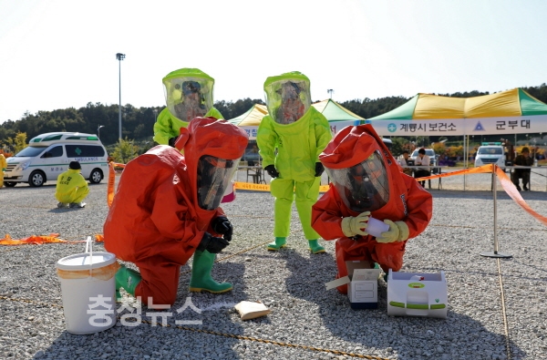 계룡시는 지난 17일 계룡문화예술의전당 주차장에서 생물테러를 대비한 모의 훈련을 실시했다.