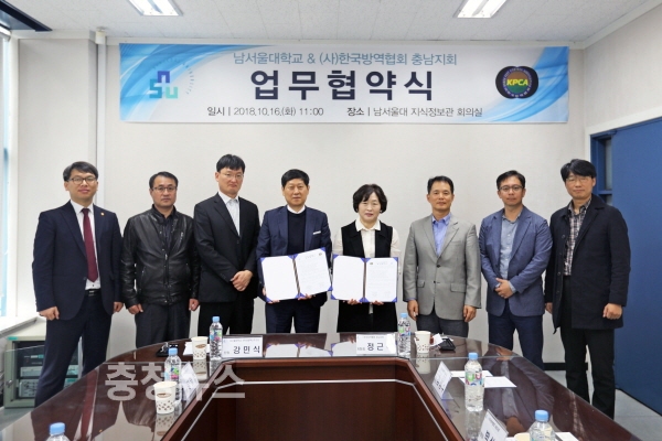 남서울대학교(총장 윤승용)가 16일 남서울대 지식정보관에서 방제·방역 분야 드론 활성화에 앞장서기 위해 ㈔한국방역협회 충남지회(지회장 정근옥)와 업무협약을 체결했다.