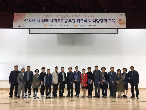 충남 아산시(시장 오세현)는 지난 19일 중앙도서관 대강당에서 복지담당공무원 170여명이 참석한 가운데 2860명을 명예사회복지공무원(행복키움추진단 및 복지이·통장, 복지반장)으로 위촉하고 이들에게 필요한 역량교육을 실시했다고 밝혔다.