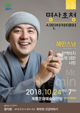시민의 교양증진과 일상에 지친 마음을 위로하기 위해 기획 운영 중인 ‘2018년 명사초청 시민아카데미’ 는 계룡시민 누구나 참석 가능하며, 지난 9월 김창옥 강사를 초청한데 이어 오는 24일에는 혜민스님을 초청 운영한다.