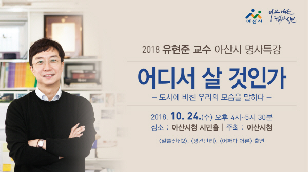충남 아산시(시장 오세현)는 24일 아산시청 대강당(시민홀)에서 건축가 유현준(tvN 알쓸신잡2 출연) 교수를 모시고 <어디서 살 것인가>를 주제로 명사특강을 진행한다.