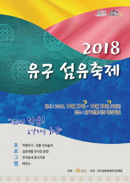 충남 공주시(시장 김정섭)는 27일부터 28일까지 유구읍 일원에서 ‘2018 유구섬유축제’을 개최한다고 23일 밝혔다.이번 축제는 ‘섬유의 한류! 도약하는 유구’라는 슬로건 아래 지역 주민들이 직접 축제추진위원회(위원장 김동찬)를 구성해 만들어 가는 시민참여형 축제로, 지역에서 생산되는 섬유를 활용한 패션쇼와 전시회를 비롯한 각종 체험, 공연 등 다채로운 프로그램이 펼쳐질 예정이다.