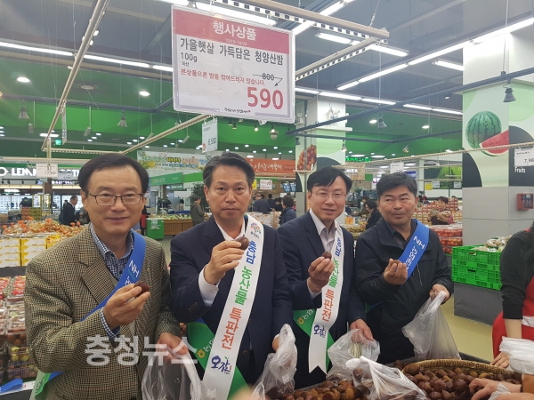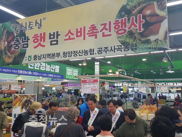 충남농협과 청양 정산농협 공주 사곡농협이 함께 대도시 농협유통 매장에서 ‘밤 소비촉진 특판행사’를 펼치고 있다.