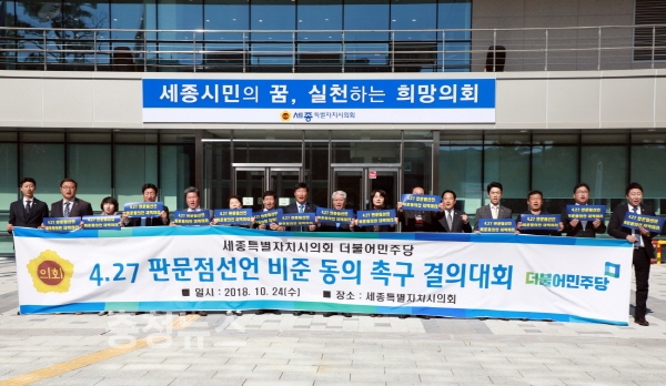 세종특별자치시의회 더불어민주당 소속 17명의 의원들이 24일 시의회 정문 앞에서 화해와 평화, 번영의 새로운 한반도를 위해 ‘4.27 판문점 선언 비준 동의 촉구 결의대회’를 개최했다.