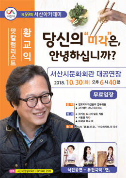 충남 서산시는 30일 서산시문화회관 대공연장에서 생생한 맛 평가로 대중들에게 인기를 얻고 있는 황교익 강사를 초청해 “당신의 미각은 안녕하십니까?”라는 주제로 제59회 서산아카데미를 개최한다.