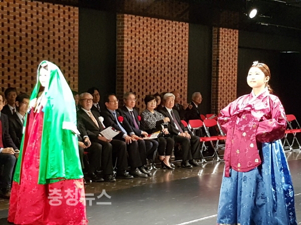 한남대-시코쿠학원대학 교류 40주년 기념 패션쇼에서 한남대 의류학과 학생들이 제작한 전통한복을 소개하고 있다.