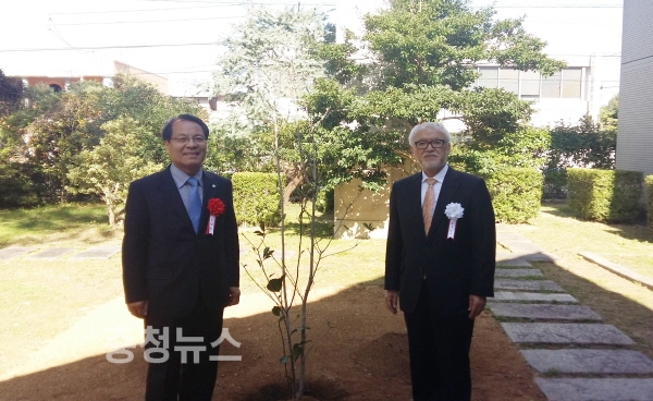 한남대 이덕훈 총장(왼쪽)과 시코쿠학원대학 스에요시 타카아키 총장(오른쪽)이 교류 40주년 기념식수를 하고 있다.