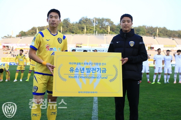 지난 21일 아산무궁화프로축구단(구단주 오세현)과 성남FC 간의 2018 K리그2 33R 경기에서 이한샘 선수의 유소년 발전기금 전달식이 진행됐다.