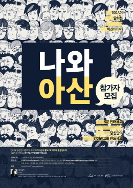 참가신청은 인터넷 온오프믹스(onoffmix.com) 사이트에 ‘100인이 말하는 나와 아산’을 검색하거나 링크(https://www.onoffmix.com/event/156364)로 접속하면 가능하다.