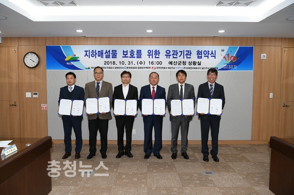 충남 예산군은 지난달 31일 군청 상황실에서 한국수자원공사 보령권지사, 한국환경공단 충청권지역본부, 한국전력공사 예산지사, (주)미래엔서해에너지, (주)KT 예산지점과 지하매설물 보호를 위한 상호 협약식을 가졌다.