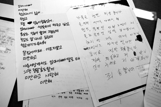 경찰청이 ‘배움터지킴이 워크숍’ 자료집에 묶어 놓은 유서에는 학교와 친구들에 대한 원망 등 극단적인 선택을 할 수 밖에 없었던 직전의 심경이 그대로 녹아 있어 보는 이들의 마음을 다시금 안타깝게 하고 있다.