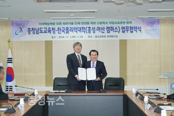 충남도교육청(김지철 교육감)은 한국폴리텍대학(홍성․아산 캠퍼스)과 1일 도교육청 정책협의실에서 미래핵심역량 갖춘 숙련기술 인재 양성을 위한 고등학교 직업훈련 업무협약을 맺었다.