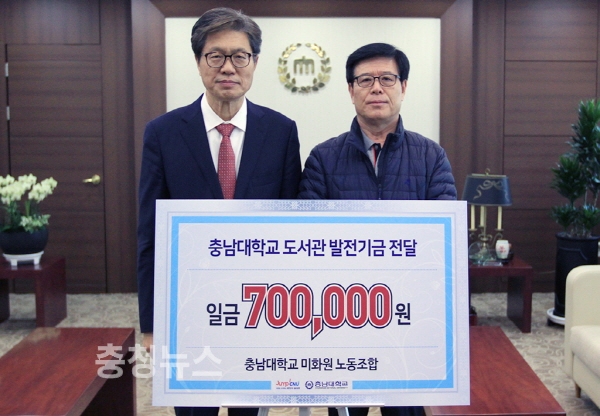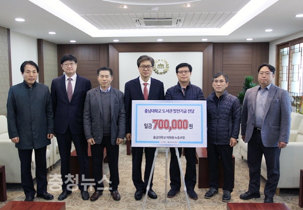 황이하 조합장 등 충남대 미화원노동조합원들은1일 오덕성 총장을 방문해 70만원의 도서관 발전기금을 기부했다.