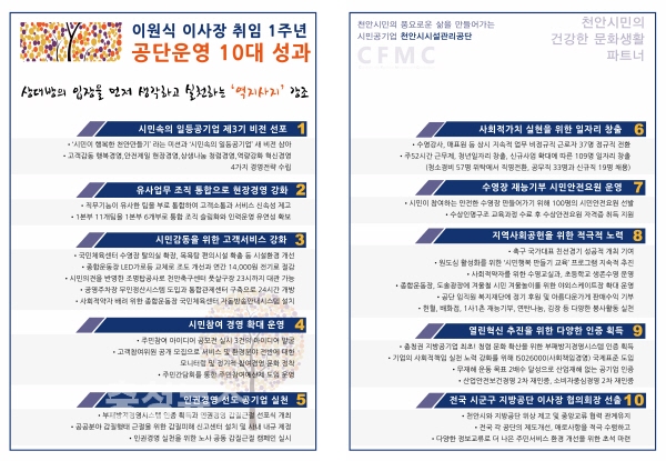 공단은 지난 1년 동안 ‘시민이 행복한 천안 만들기’ 목적과 ‘시민속의 일등공기업’이라는 비전을 새롭게 수립하고, 이에 걸맞은 8개 분야 전략과제와 고객참여위원회 확대 운영 외 34개 세부역점과제를 추진하며 다양한 성과를 창출했다.