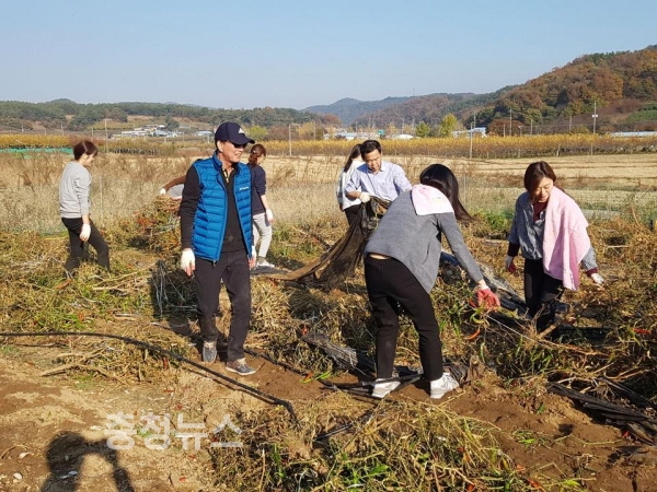 김보엽 교육행정국장을 비롯한 30여 명의 교육청 직원들이 세종시 연서면 청라2리 농가를 방문해 고춧대 제거, 폐비닐 정리 등 고추밭 정리 작업에 참여해 일손이 부족한 농가의 시름을 덜어주기 위해 구슬땀을 아끼지 않았다.