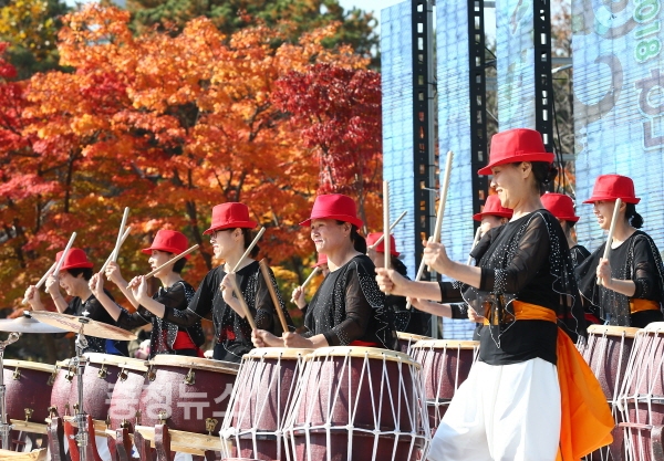 ‘2018 노은한마음축제’에서 주민들이 난타 공연을 펼치고 있다.