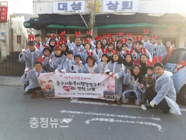 대전 중구 사회복지행정연구회(회장 최순덕)는 지난 3일 회원과 그 가족 70여명이 함께 동절기 난방이 취약한 가정에 연탄 1천장(70만원 상당)을 전달했다.
