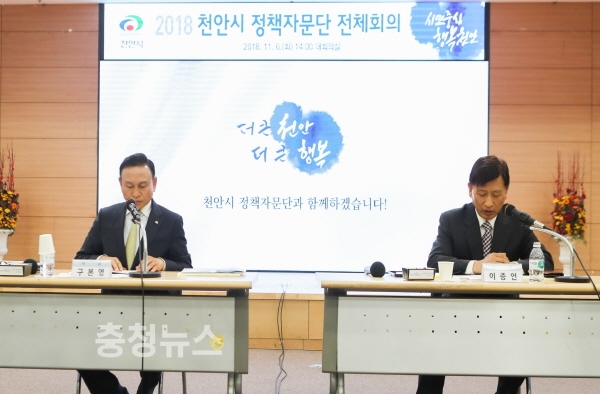 충남 천안시는 6일 시청 대회의실에서 구본영 천안시장과 제9기 천안시 정책자문단(단장 이종언 공주대학교 교수), 간부공무원 등이 참석한 가운데 ‘2018 정책자문단 전체회의’를 열었다고 밝혔다.