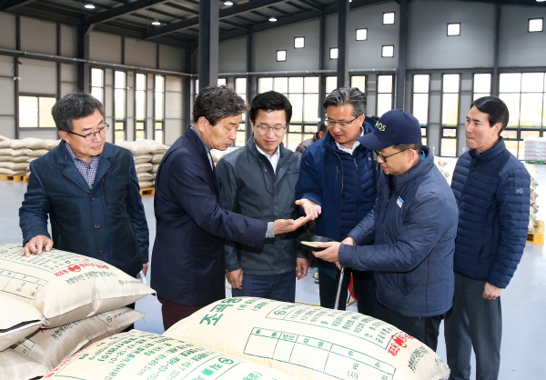 6일 유성농협신창고에서 진행된 2018년산 공공비축 미곡 매입 현장에서 정용래 유성구청장(오른쪽에서 세 번째)과 허태정 대전시장(왼쪽에서 세 번째)이 쌀 상태를 확인하고 있다.