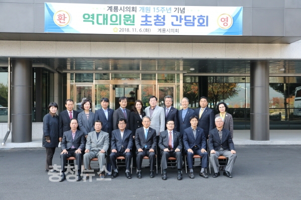 계룡시의회(의장 박춘엽)는 6일 오전 계룡시의회 3층 소회의실에서 전․현직의원 등 총 40여명이 참석한 가운데 「계룡시의회 개원 15주년 기념 역대의원 초청간담회」를 개최했다.