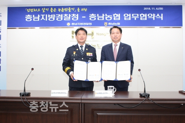 충남지방경찰청(청장 이재열)과 농협중앙회 충남본부(본부장 조소행)는 6일 오후 내포신도시 소재 농협충남본부에서 안전하고 살기 좋은 농촌 만들기를 위한 업무협약을 체결했다.