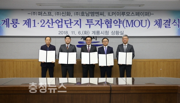 시는 6일 시청 상황실에서 시장, 기업대표, 관계공무원 등 20여 명이 참석한 가운데 계룡 제1‧2산업단지 내에 입주할 4개 기업 ㈜퍼스프, ㈜신화, ㈜호남엠엔씨, ILP와 합동투자 협약식(MOU)을 맺었다.