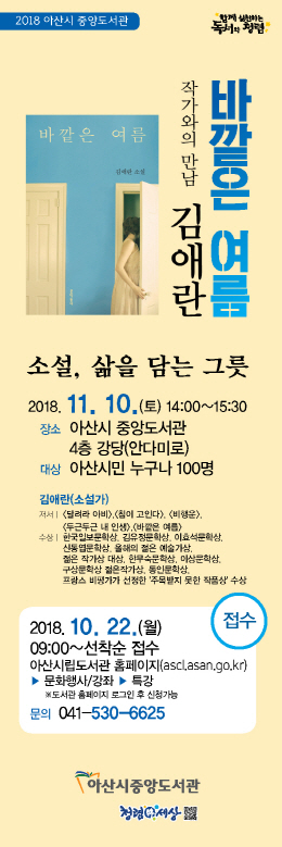 충남 아산시 시립도서관(관장 김선옥)은 10일 중앙도서관 4층 강당에서 <바깥은 여름>의 김애란 작가(소설가)를 초청해 강연회를 개최한다.