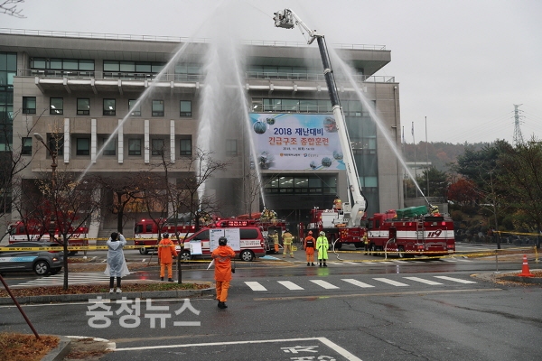 8일 한밭대학교 대학본부 일원에서 열린 “2018년 재난대비 소방서 합동 긴급구조 종합훈련”에서 소방대원들이 화재를 진압하고 있다.
