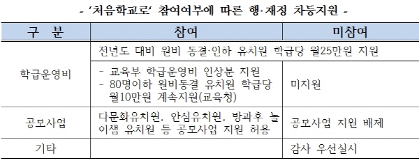 이에 대해 대전교육청은 ‘처음학교로‘의 실효성과 학부모의 만족도를 향상시키기 위한 방안을 마련했다. 세부적으로 참여유치원에는 2019년 교육부의 학급운영비 인상분(학급당 월 15만원내) 및 교육청의 80명 이하 원비동결 유치원 학급운영비 월10만원 계속 지원, 공모사업 허용 등을 지원한다. 불참유치원에는 이러한 지원을 배제하고, 우선적으로 감사에 나서기로 했다.