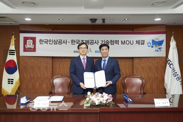조용만 조폐공사 사장과 김재수 인삼공사 사장은 12일 한국인삼공사 서울 본사에서 만나 ‘짝퉁’ 방지를 위한 브랜드 보호기술 협력을 골자로 하는 양해각서(MOU)를 체결했다.